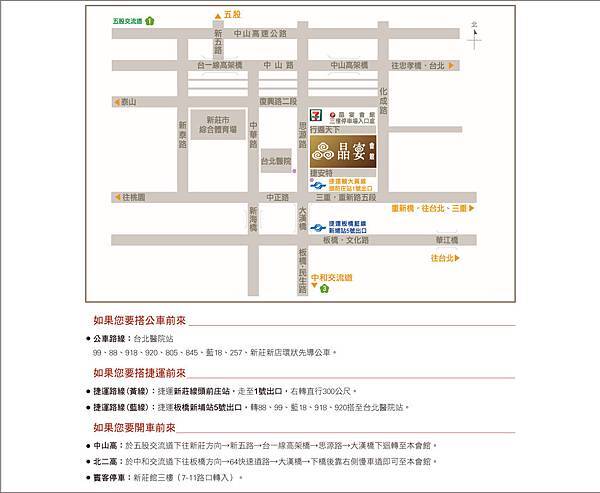 北二高:於中和交流道下往板橋方向→台64線東西向快速公路八里新店線→大漢橋→下橋後第一個紅綠燈切至右側慢車道即可至本會館。
